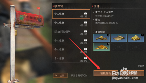 之前我们在邮箱中收到材料之后需方法取到背包,然后在存到柜子里。更新之后邮箱多了个智能存柜的选项,这样也就可以直接存到柜子里了。那么,具体怎么用呢。