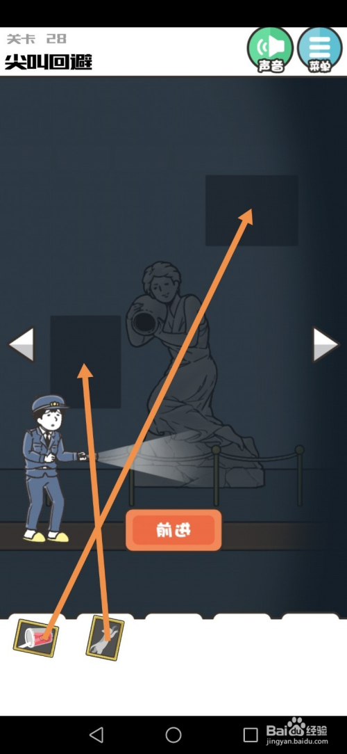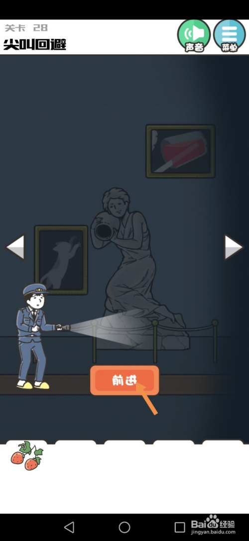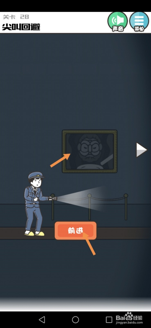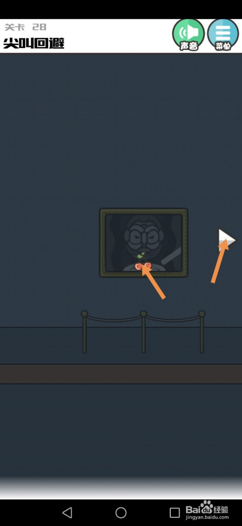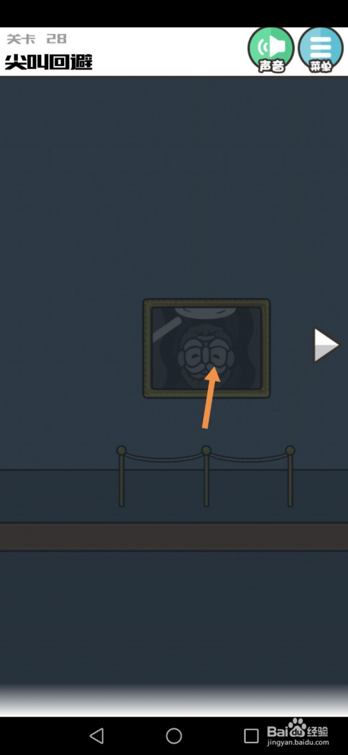 第28关先点击墙上的画,然后点击进步按钮到右边去。