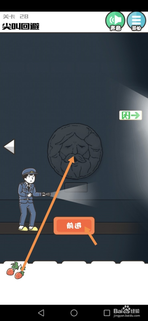 在最右边,将草莓拖动到墙上石像上,然后点击进步按钮就可以过关了。