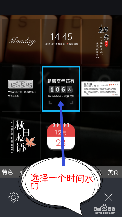 在拍摄照片前,先在水印相机的里面,选择一个时候水印,点击设置一个水印。如图所示