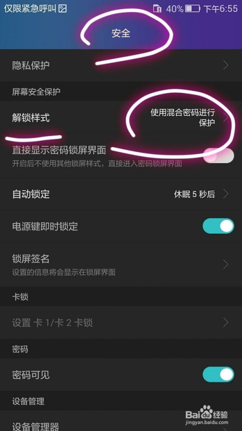 最后可以在返回的平安设置页面中看到解锁样式为夹杂密码。