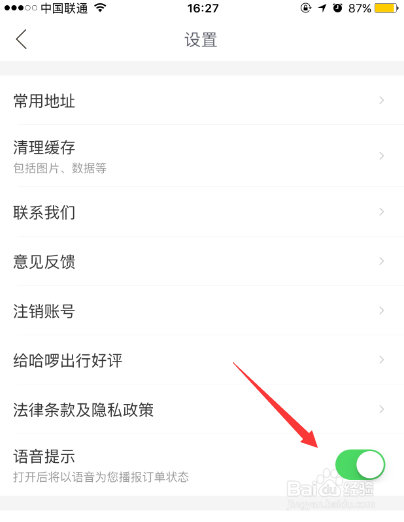 如图示,我们将语音提醒选项开关打开即可。这样,我们就当作功打开哈啰出行的语音提醒了。伴侣们,你们都学会了吗?