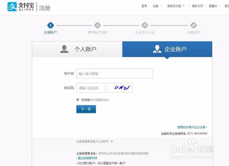 百度---【支付宝】---点击注册---选择注册企业账户。输入注册电子邮箱