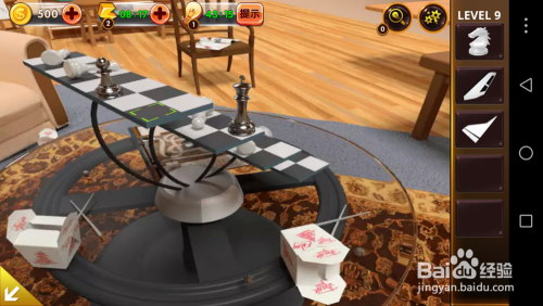 点击中心的桌子,将国际象棋放进去,再从一端跳入到另一端,掏出里面的飞机模子零件。