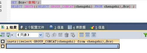 SELECT INSTR((SELECT GROUP_CONCAT(chengshi) FROM chengshi),@cs) ;