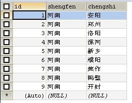 insert into `chengshi` (`id`, `shengfen`, `chengshi`) values('3','河南','洛阳');
