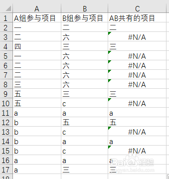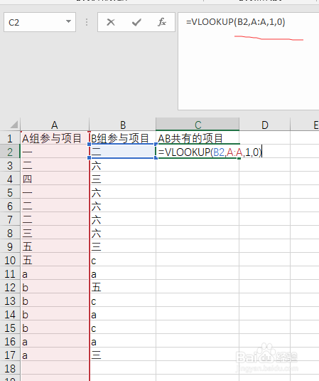 如图示,找出A列和B列中共有的项目,考虑数据量的问题,这里不建议利用去除反复值的方式,保举利用vlookup函数