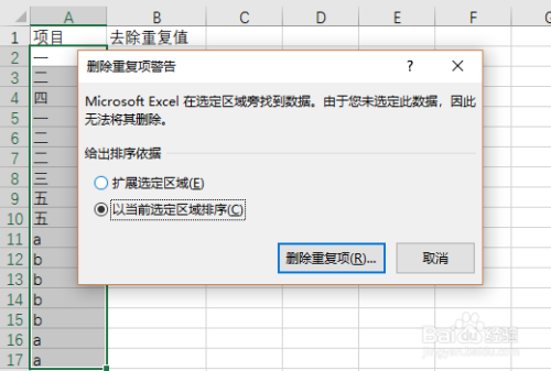 选择以当前选定区域排序-确定(若为多列,可选择扩展选定区域,删除多列反复值)-全选-确定