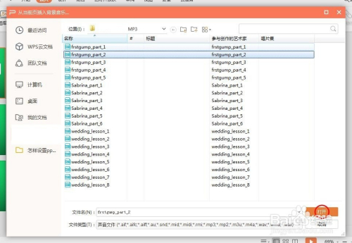选摘要插入的音乐,单击“打开”按钮。