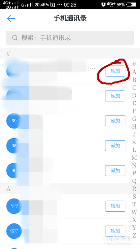 可以看到通信录名字后面都有添加字符,我们想要添加哪一个老友,直接点击后面的添加即可。