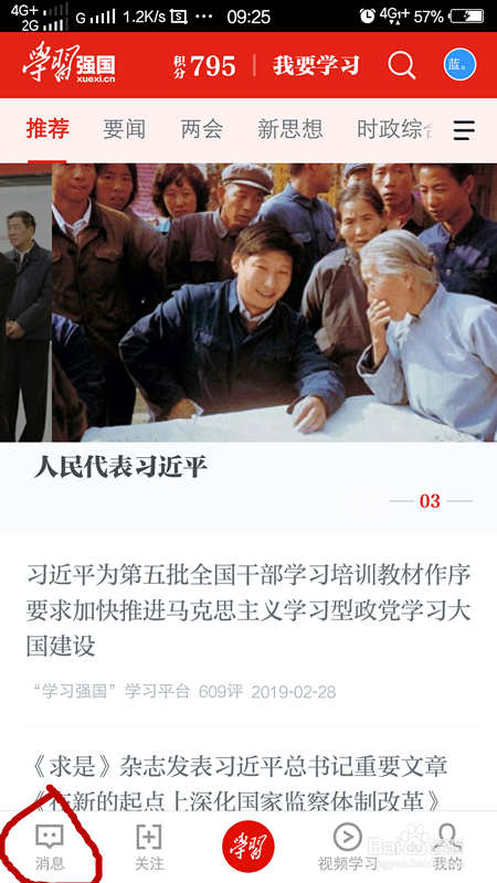 我们进入学习强国动静界面今后,可以看到右上角有一个加号,我们点击右上角的加号。