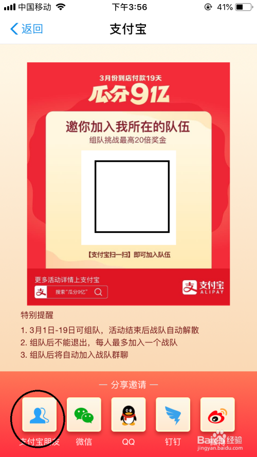 在支付宝中又有一个瓜分红包活动了,不外此次活动本家儿要到店付条目即可加入本次的瓜分活动,只要在19天之内到店体付条目即可加入本次的活动奖励,若是想要更大的红包可邀请组队,那么怎么邀请老友呢,下面,我会这个分享给大师。