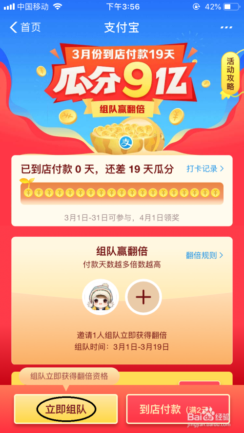 然后打开了到店付条目的签到界面中点击“当即组队”按钮。