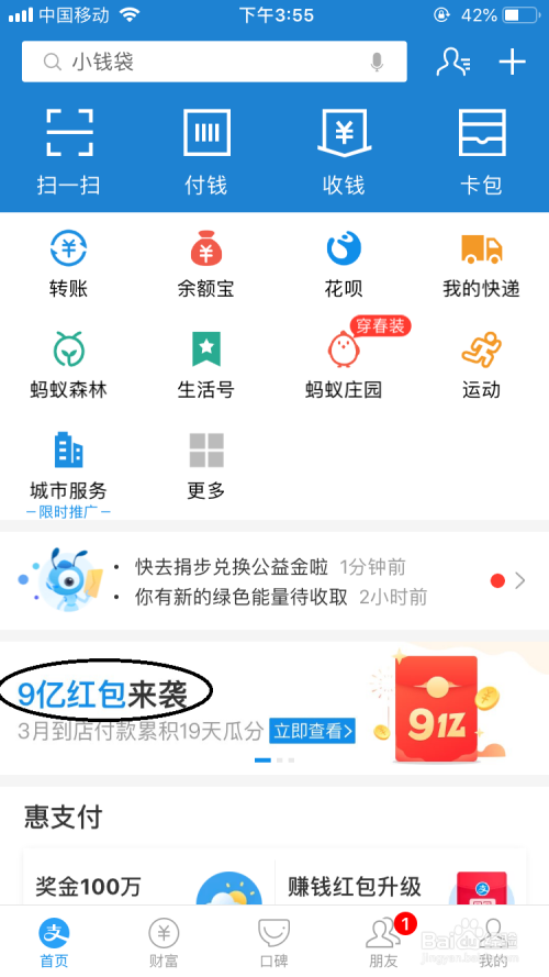打开支付宝界面中点击“首页”选项栏即可显示中“9亿红包来袭”活动并点击。