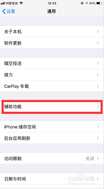 在通用本家儿页下,细心寻找找到【辅助功能】一栏,如图所示,点击进入辅助功能本家儿页!