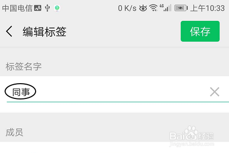 点击确定今后才可建立标签名称,我们直接在标签名字下方输入合适的名称就行,好比“同事”,点击保留今后新标签就建立当作功了;