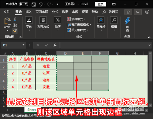 接着我们将鼠标移到方针单位格区域上(就是把复制后的内容放在本身想放的处所),并单击一下鼠标左键,这时该区域的单位格就呈现了边框。如图所示: