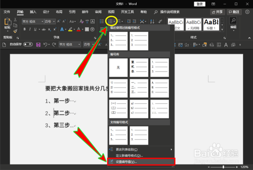 在“起头”菜单下找到“段落”选项组,在选项组里继续找到“编号”功能按钮,点击按钮旁边的小三角,打开其下拉菜单,然后选择下拉菜单中的“设置编号值”选项。