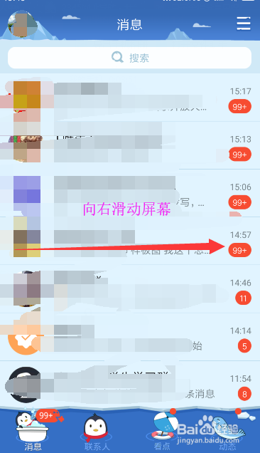 在进入QQ界面,标的目的右滑动屏幕,滑出左侧列表,如图所示