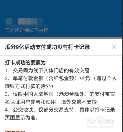 - 6有多个支付宝账号的童鞋,只能是有一个能加入这个活动的,别的的账号加入不了,所以也没有打卡记实