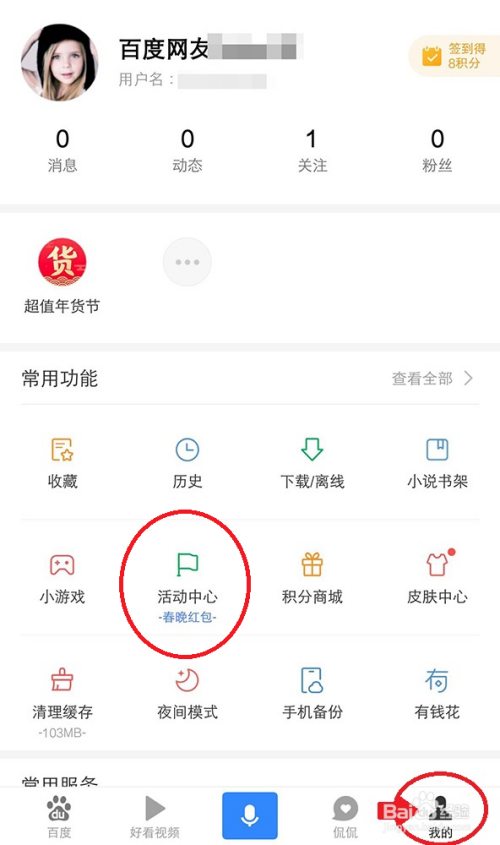 手机打开百度APP,选择“我的”,点击【活动中间】