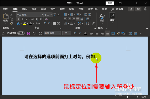 打开Word文档,我们将鼠标定位到需要输入“方框里打钩符号”处。如图所示: