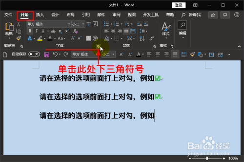 跟方式一和方式二一样,先将鼠标定位到需要输入符号处。接着我们点击“起头”菜单,再单击“字体”组右侧的下三角符号,这时会呈现“字体”弹窗。如图所示: