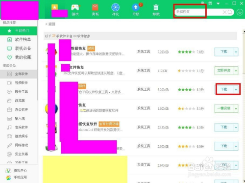 第二种方式:用数据恢复东西恢复。先打开软件管家——输入:数据恢复——在搜刮成果中选择一种恢复东西进行下载安装。