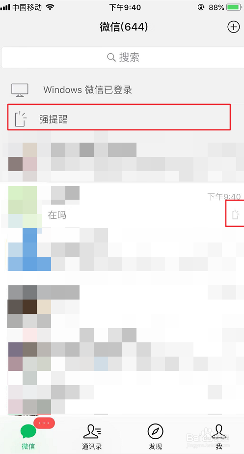 当“强提醒”被激活后,会在微信本家儿界面显示“强提醒”,而在联系人右侧也会显示小图标