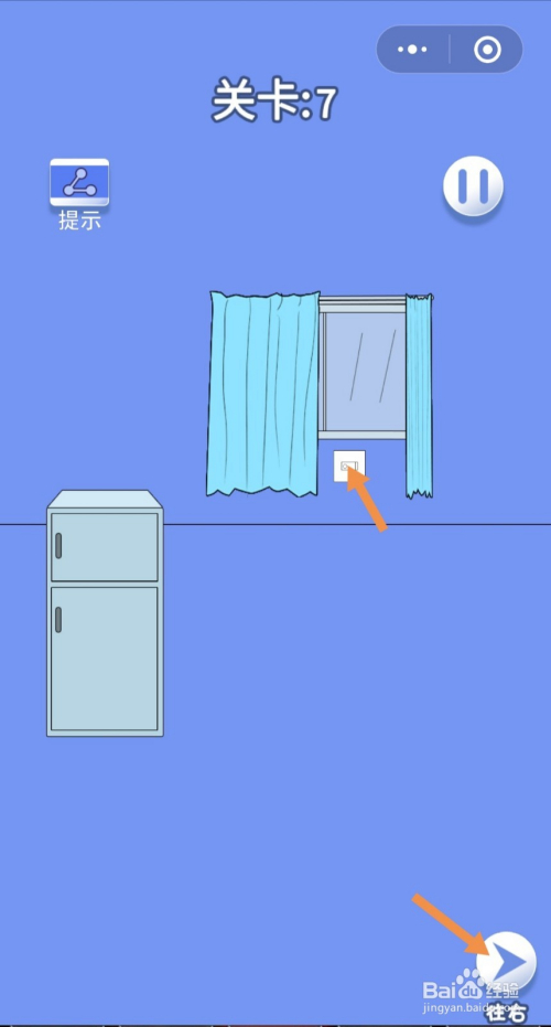 第7关先点击右边窗帘,接着点击墙上的开关把灯关失落,然后点击标的目的右箭头进入右边的房间。