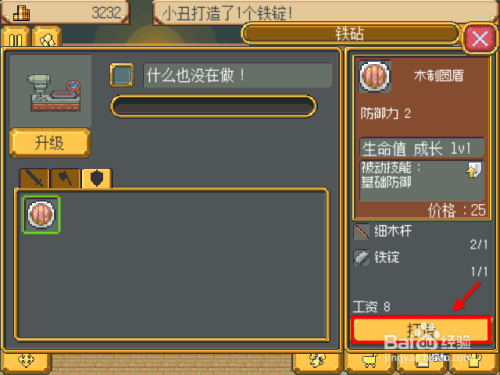 耗损细木杆x2,铁锭x1打造木质圆盾,可用于自身装备,也可以出售或完当作使命。