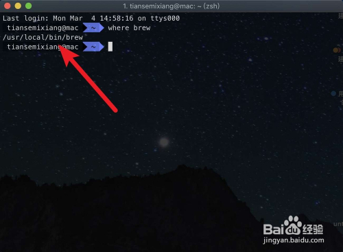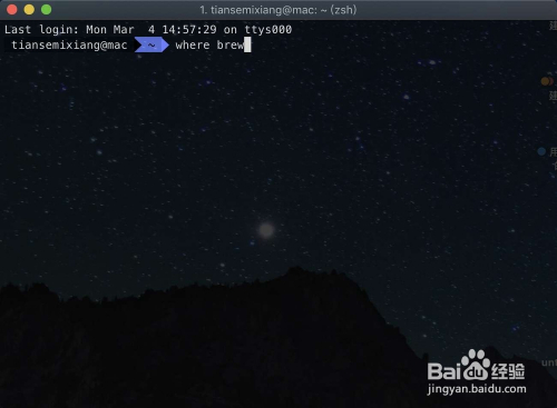 然后空格之后,输入【brew】,回车,那么获得安装的路径。