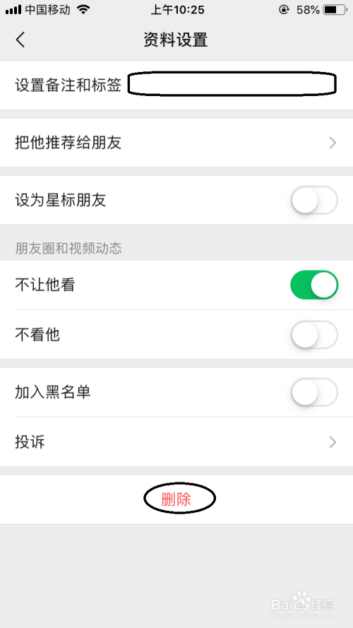 打开资料设置界面选项下点击“删除”。