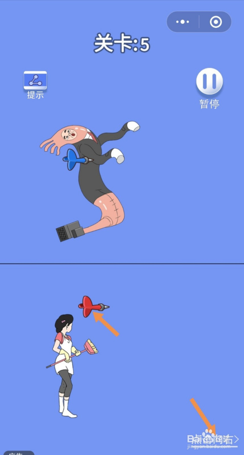 在右边房间里,点击蓝色飞镖,然后点击点击标的目的左进入左边的房间。