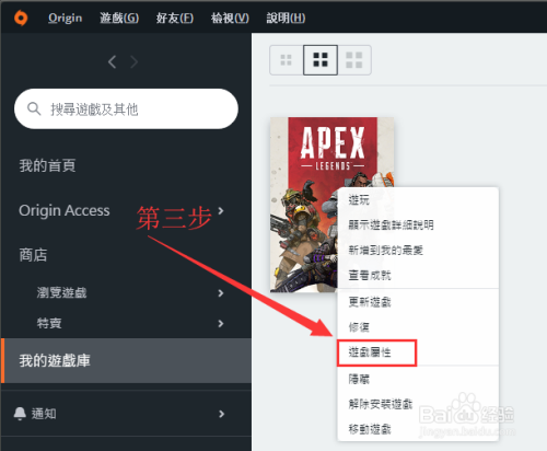 说话设置步调三:在Origin游戏库中,游戏玩家找到并右击Apex游戏。然后在右击菜单中点击选项“游戏属性”。