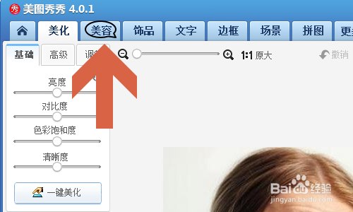 从照片中的人物来看,她的额头有着很深的皱纹,想要将其去失落,我们就要点击最上方东西栏的“美容”;