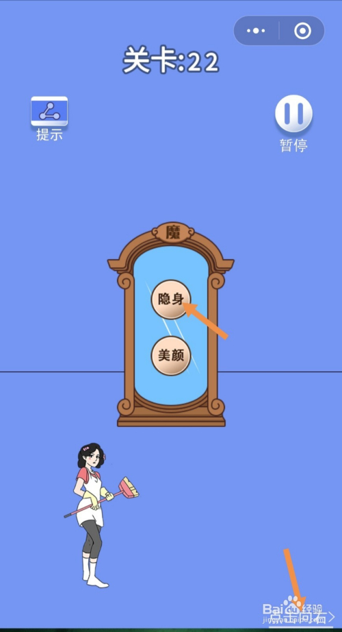 第22关点击镜子上隐身这两个字,隐死后点击点击标的目的右进入右边的房间。