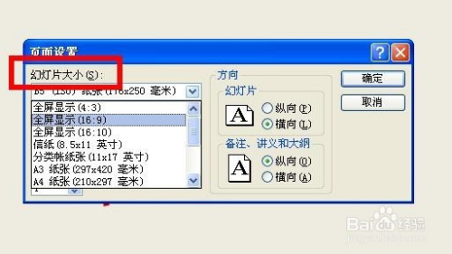 在“页面设置”对话框中找到“幻灯片大小”,点击下拉箭头