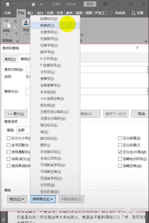 2、在界面中找到“更多”,在更多中找到特别格局,点击段落标识表记标帜(p),在查找内容栏至少点击两次,即呈现两个^p.