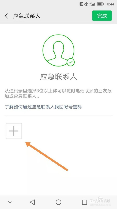随后进入“应急联系人”的设置页面,我们点击屏幕下方的加号,这样可以选择添加老友为应急联系人。