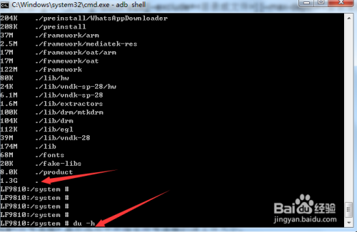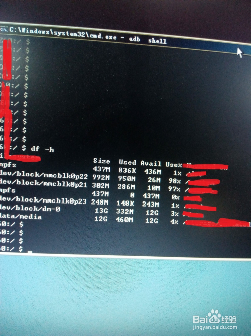 利用adb shell 号令。利用df号令,可以查看当前手机具体空间占用环境,如下图所示