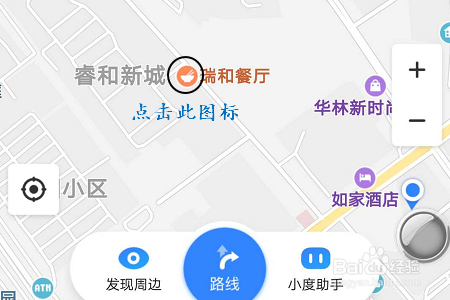 下图就是百度地图APP首页,这里会显示今朝我们地点的位置,并且一些诸如银行、餐厅或者超市这样的地标城市有显示,我们只需点击图标就行;