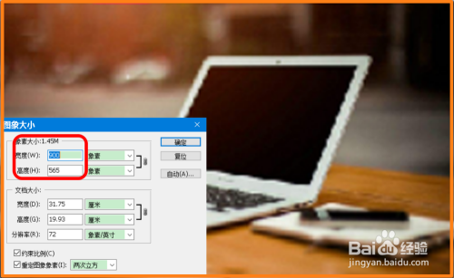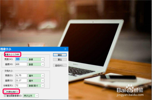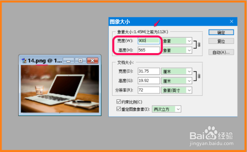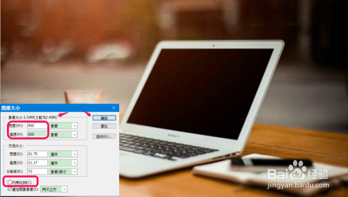 去失落【约束比例(C)】前面复选框内的小勾,将图片像素宽度更改为:900,高度更改为:600,点击:确定;