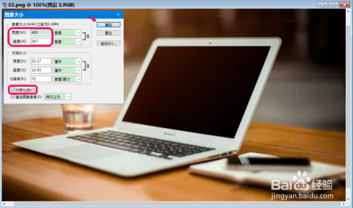 选择【约束比例(C)】,将图片像素宽度更改为:600,则高度按照比例主动更改为:367,点击:确定;