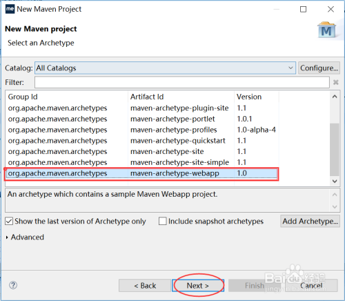 我们选择maven-archetype-webapp,然后点击“Next”,如下图所示: