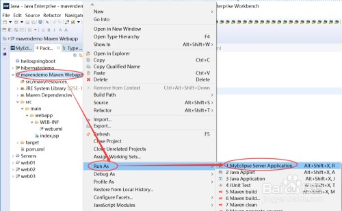 然后我们右键项目,依次选择“Run As”->“MyEclipse Server Application”,如下图所示: