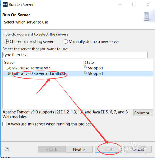 我们点击设置装备摆设好的Tomcat办事器,然后点击Finish,如下图所示: