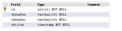CREATE TABLE `chengshi` ( `id` int(11) NOT NULL AUTO_INCREMENT, `shengfen` varchar(10) DEFAULT NULL, `chengshi` varchar(10) DEFAULT NULL, `shijian` timestamp NOT NULL DEFAULT CURRENT_TIMESTAMP ON UPDATE CURRENT_TIMESTAMP, PRIMARY KEY (`id`)) ENGINE=InnoDB AUTO_INCREMENT=10 DEFAULT CHARSET=utf8