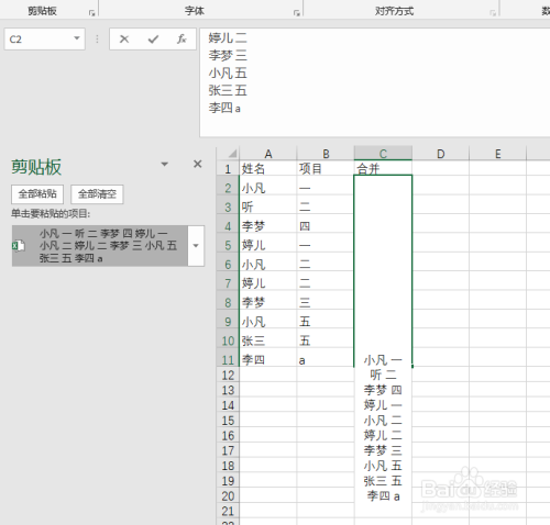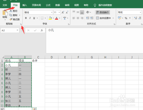 如图示,将所有人的姓名和项目归并至C列。选中数据区域-ctrl+c复制-东西栏起头-单击剪贴板的右下角箭头