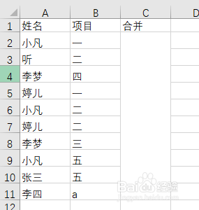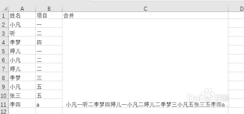 利用phonetic函数,一键归并内容,在C列输入“=PHONETIC(A2:B11)”,回车,归并结果如图示。